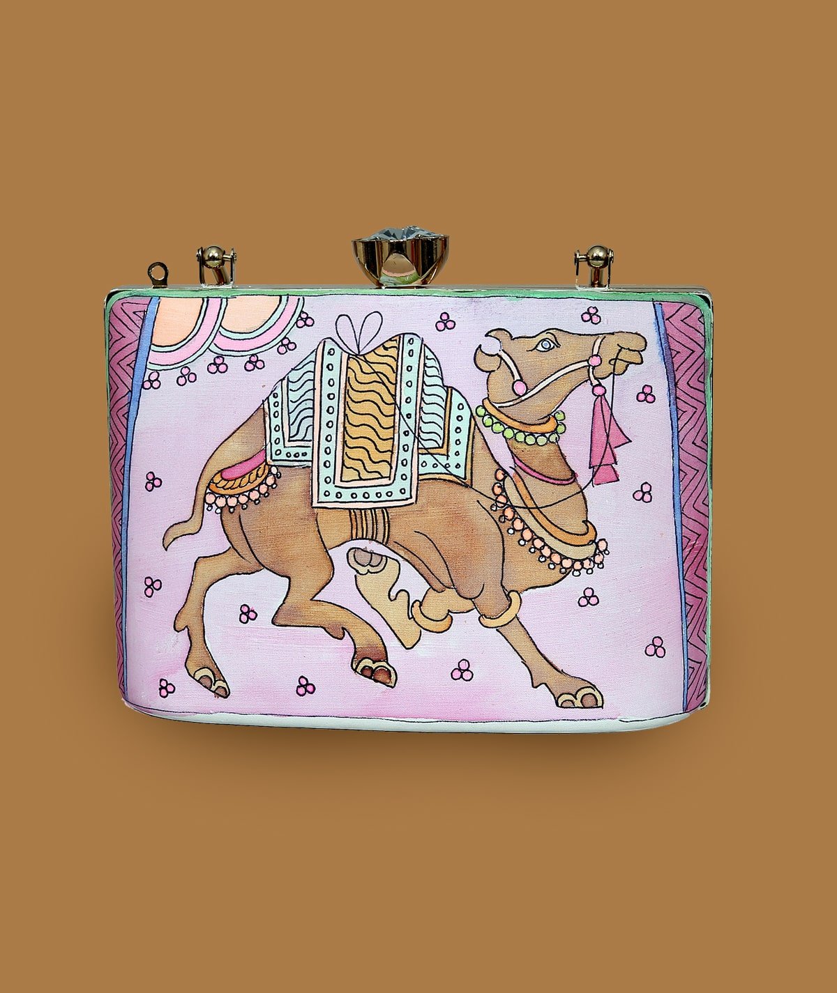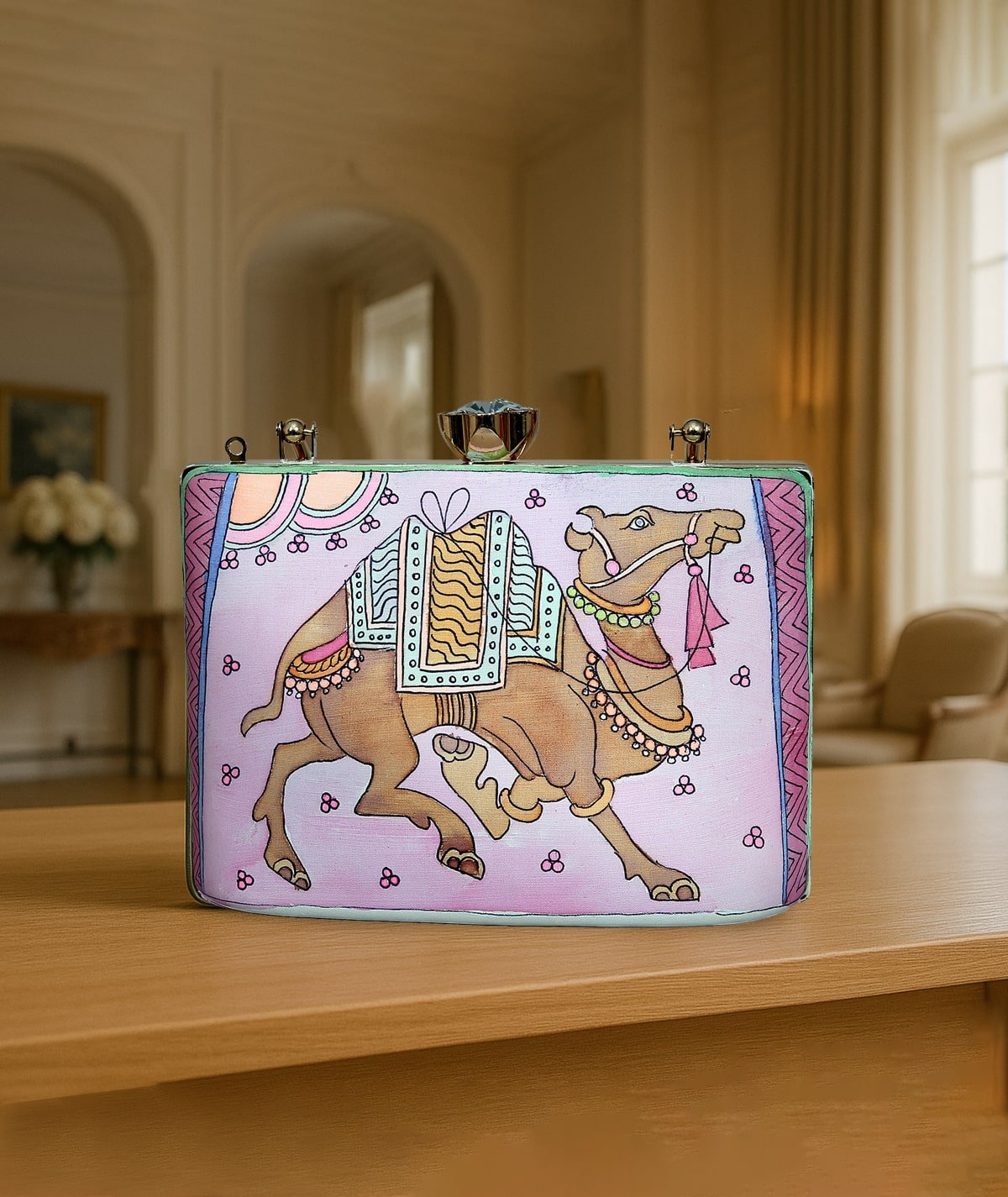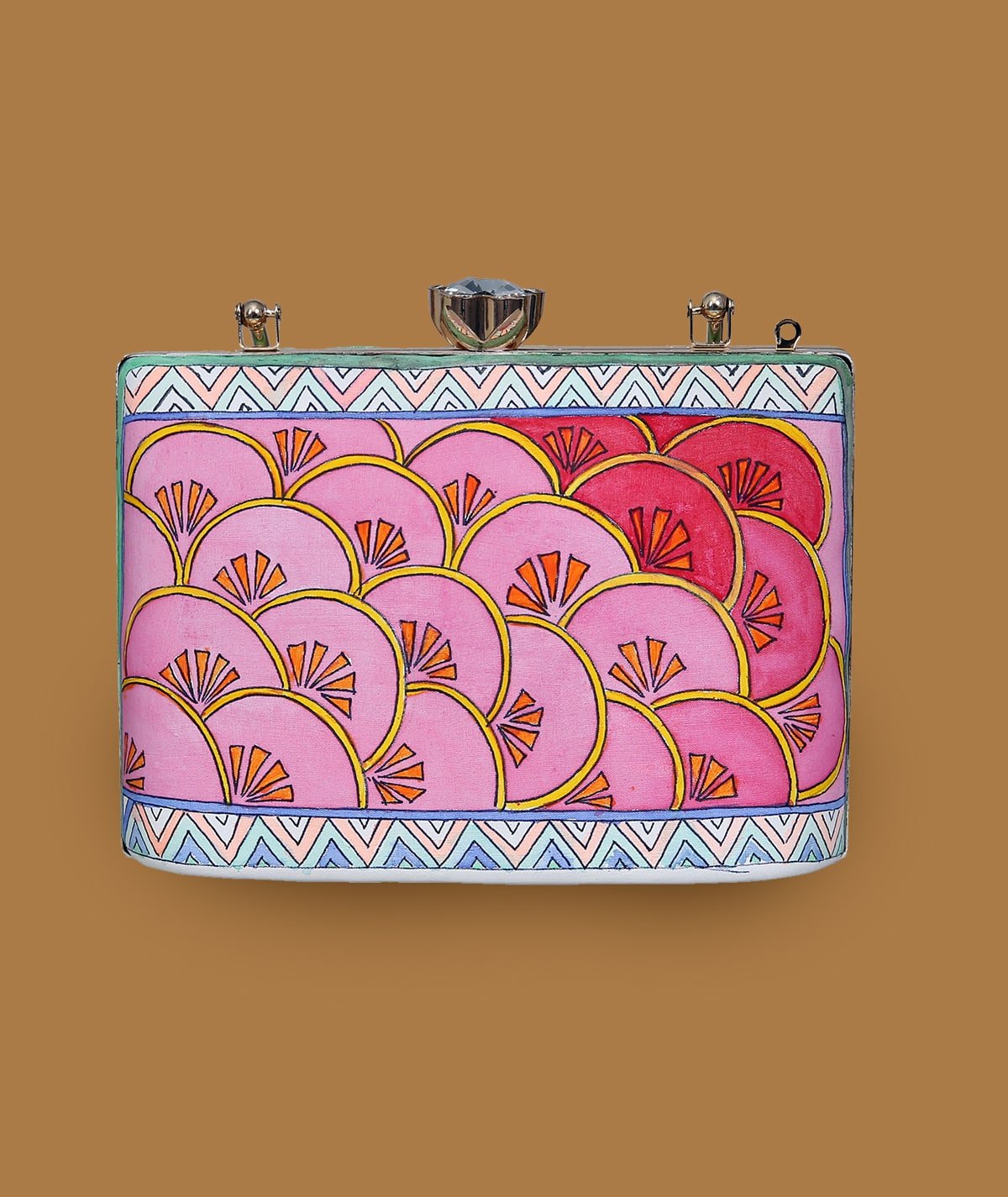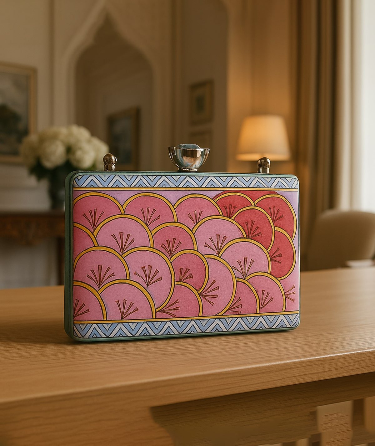 This βClutch Bagβ transforms fashion into a captivating canvas, merging function with fine art. The central motif showcases a swirling, abstract design of soft blues and muted earth tones, suggestive of a storm in motion or an ethereal dance. With metallic accents, a delicate chain strap, and a compact, structured form, this piece elevates any ensemble with its blend of artistic flair and practical sophistication. The hand-painted quality offers a glimpse into a narrative of natureβs elegance, harmonizing the flowing lines with the solidity of the structure.