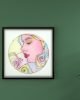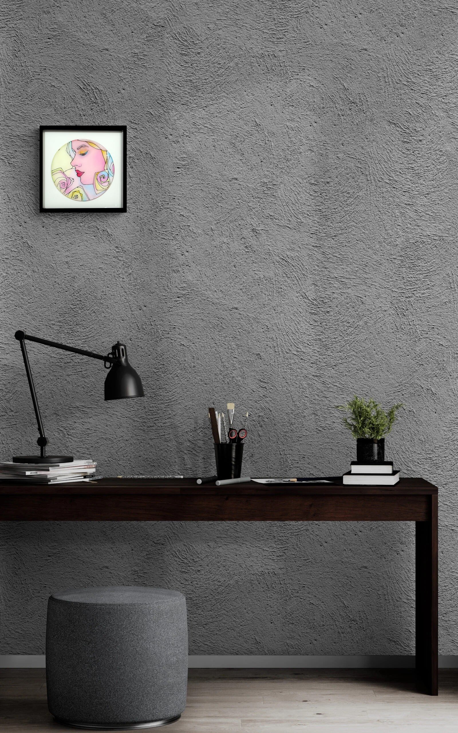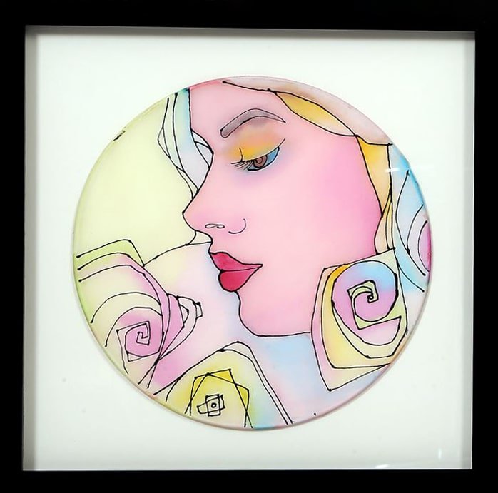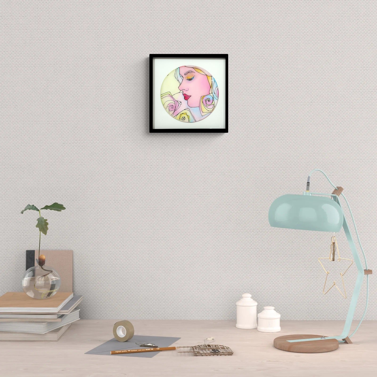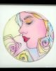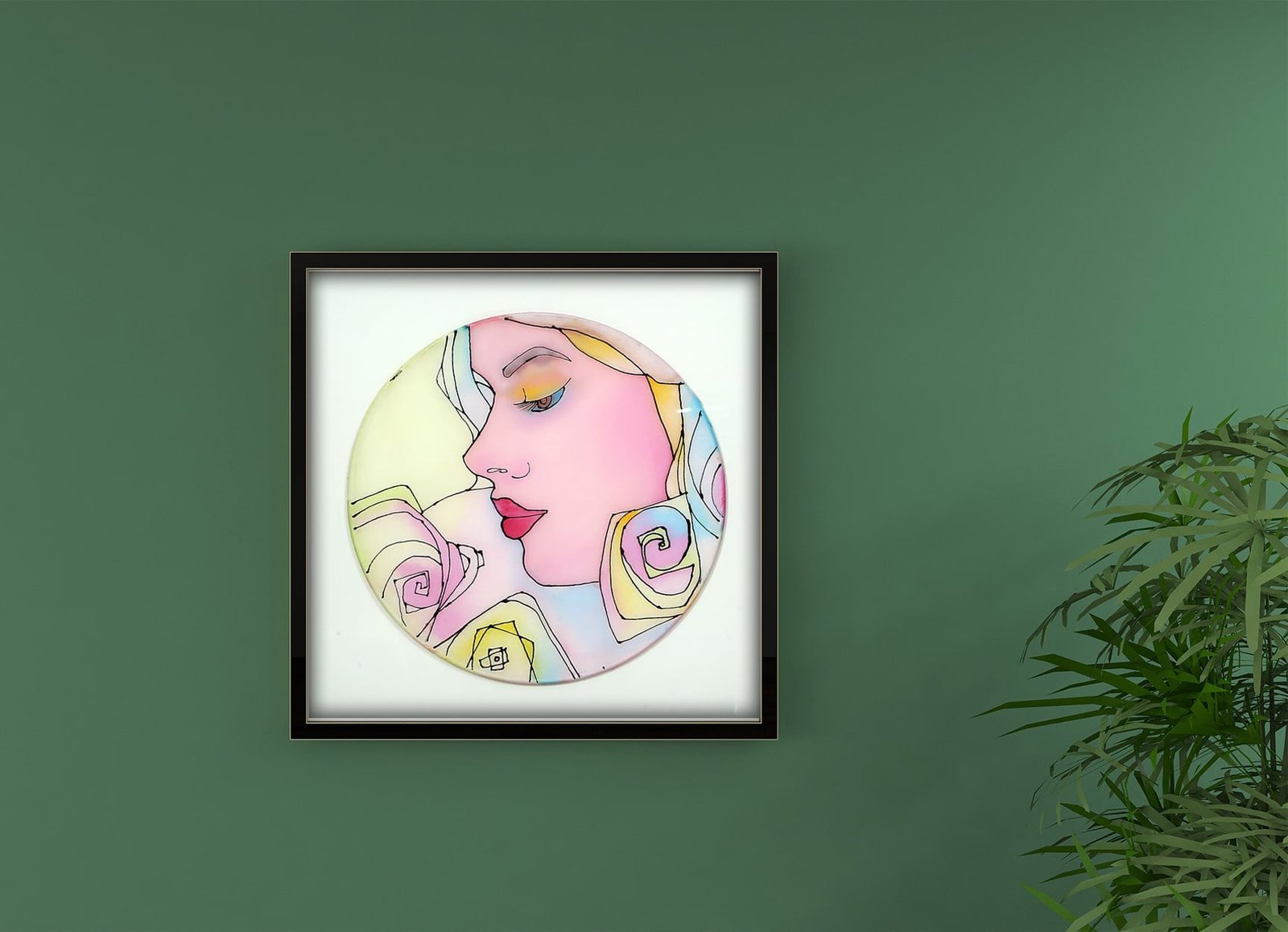 “Graceful” is a soft, dreamlike portrait that captures the serene beauty and calm of a woman lost in thought. The gentle lines of her profile are accented with soft pastels—pinks, yellows, and blues—creating a delicate and ethereal atmosphere. Her closed eyes and slightly tilted head suggest introspection, while the stylized, swirling shapes around her resemble abstract roses, symbolizing beauty and femininity. The circular composition enhances the flow and harmony of the piece, giving it a meditative and tranquil quality. This artwork is a poetic tribute to grace and inner peace, embodying elegance in both form and color.