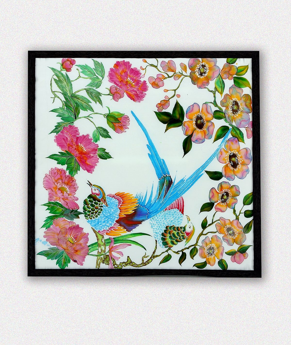 βOrientalβ is a vibrant and intricately detailed depiction of two exotic birds nestled among lush, blooming flowers. The artwork, filled with bright, vivid colors, showcases the elegance and beauty of nature, drawing inspiration from traditional Oriental art. The birds, adorned with striking blue, red, and gold feathers, are the focal point, surrounded by a delicate floral arrangement of pink and orange blossoms. The composition, framed by flowing vines and branches, evokes a sense of harmony and balance, capturing the essence of Eastern aesthetic principles. This piece celebrates the timeless beauty of nature, rendered in a style that is both graceful and richly decorative.